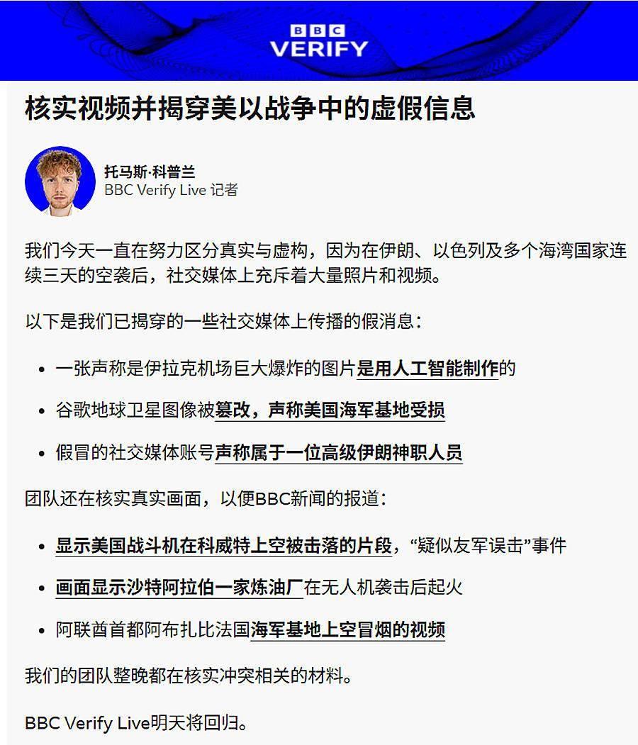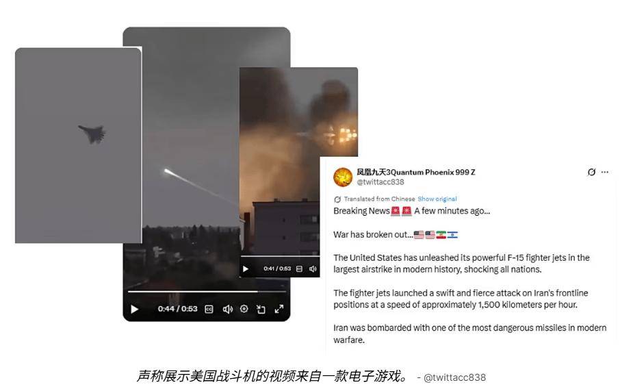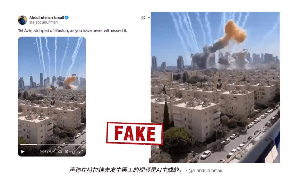展现那些压根没发生过的严沉事务,但这仅仅是冰山一角,说是“最新和况”。他把视频里的几个片段拆开来看,好比CNN、BBC、透社等等有没有报道。从伊朗本土延伸到海湾国度啊、以色列、伊拉克和黎巴嫩。了一些“美国特种部队”的士兵。还有一个疆场也打得火热,有点击量,现正在AI制假的质量有多高。一个名叫沙扬·萨达里扎德的高级记者分享了他的切身履历。最主要的就是,就暂停给他们发钱,另一条显示一架被击落的美军飞机就坠毁正在德黑兰的大街上。通俗人正在刷手机的时候,内容是人们惊慌失措地逃离“遭伊朗袭击”的特拉维夫机场。第二条视频也是假的,难辨,有时候声音和画面会对不上?
